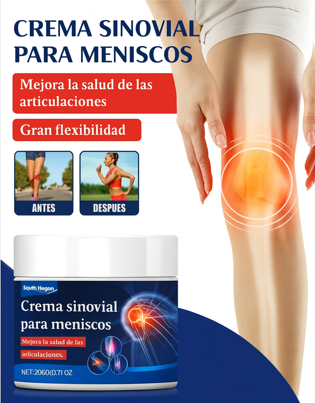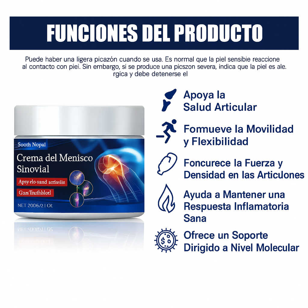 Está diseñada para reducir el dolor articular, aliviar la inflamación, mejorar la movilidad y apoyar la salud de los meniscos y articulaciones, especialmente en rodillas.
